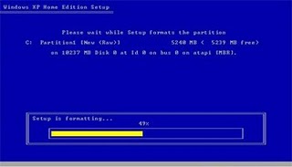 Kemudian arahkan pointer pada posisi “unpartitioned space”, lalu tekan “C” maka akan muncul gambar seperti gambar sebelumnya, dalam hal ini layar yang akan muncul seperti gambar sebelumnya menunjukan sisa partisi yang telah anda bagi, jika anda cuma membagi 2 partisi saja maka langsung tekan “ENTER” tapi jika anda ingin mempartisi lagi sisa hardisknya maka tinggal di bagi lagi aj, seperti langkah-langkah sebelumnya, setelah selesai partisi ketika anda menekan “ENTER” seperti yang di jelaskan di atas, maka akan muncul gambar sperti gambar diatas, setelah itu arahkan poiter di posisi C: partition1 [New Raw], tapi biasanya sudah berada di posisi tersebut, maka anda tinggal menekan “ENTER” saja untuk proses instalasi windows, kemudian akan muncul proses format seperti gambar di bawah ini