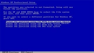 kemudian pilih “format the partition using the NTFS file system (Quick)” atau “format the partition using the NTFS file system (Quick)” lalu tekan “ENTER” maka akan muncul layar sepert gambar di bawah ini