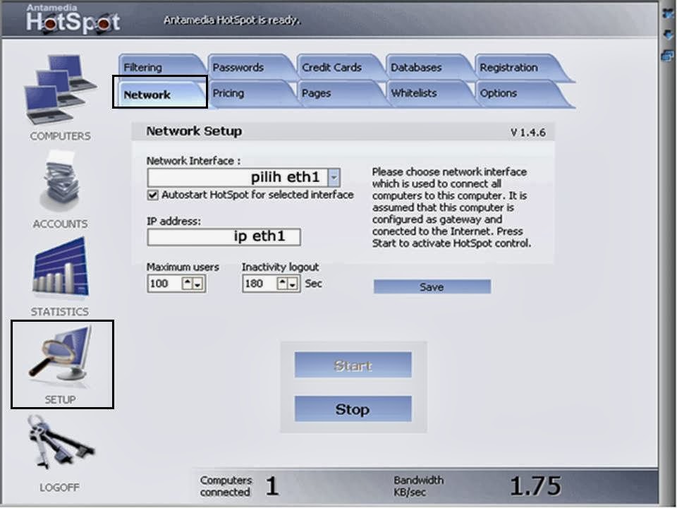 - Install Antamedia Billing HotSpot. kalo belom punya softwarenya, nih sedot disini nihhttp://www.antamedia.com/download/bandwidth/
