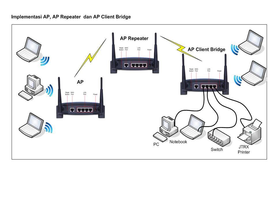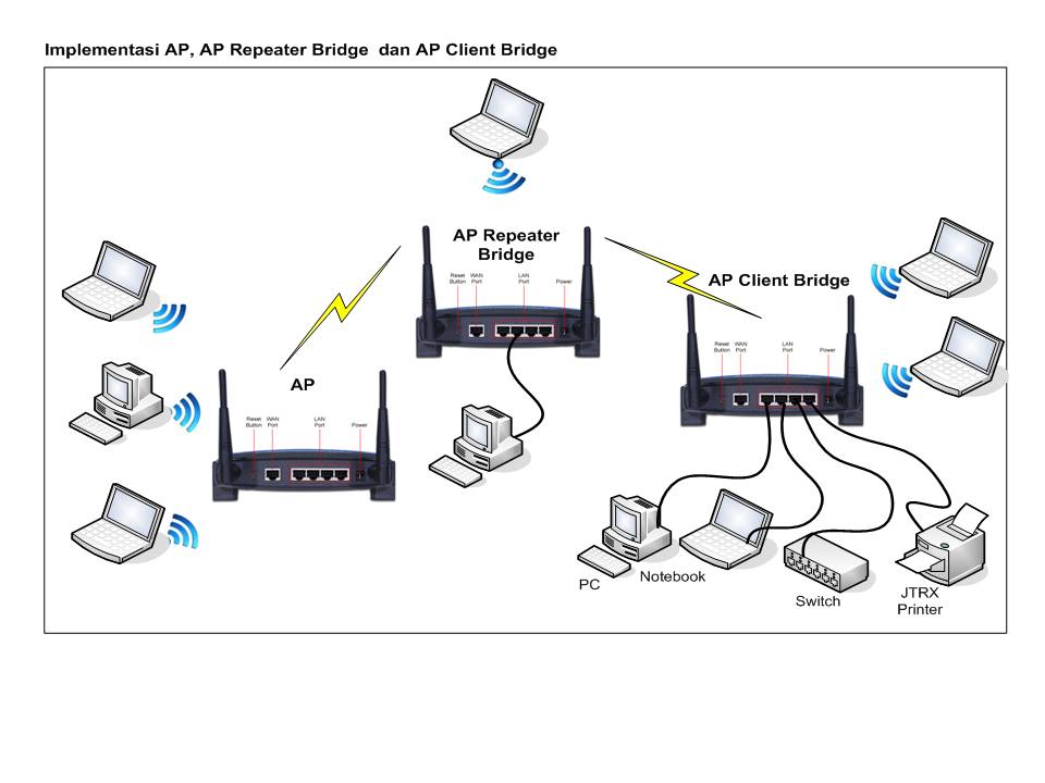 nggak ada kerjaan niih .. mending kita berbagi pengetahuan aja deh .. Tidak semua AP mendukung mode-mode tersebut oleh karena itu ketika kita ingin membeli wireless AP harus dipertimbangkan kebutuhan secara menyeluruh. Mode : Acess Point Mode Acess Point merupakan mode yang pasti digunakan pada mode jaringan wireless apapun. AP berperan sebagai central node dan penguat signal pada jaringan wireless. Gambar 6.1 Acess Point Mode Mode : AP Client Mode AP Client merupakan mode AP yang dijadikan client dari AP utama. Jadi AP utama akan memiliki hubungan dengan AP client secara langsung, karena perannnya sebagai AP Client maka tidak ada host yang bisa melakukan koneksi langsung ke AP client sehingga hanya port-port LAN saja yang bisa bekerja. Model AP ini biasa diterapkan jika ingin menghubungkan AP untuk beberapa lantai, misalnya : Rumah Sakit, Kantor, dan lain sebagainya. Mode AP Client, digambarkan seperti berikut ini : Gambar 6.2 Implementasi AP Client Mode : Acess Point Client Bridge Mode Acess Point Client Bridge mirip sekali dengan mode AP Client. Mode AP Client Bridge, digambarkan seperti berikut ini : Gambar 6.3 Implementasi AP Client Bridge Mode : Acess Point Repeater Mode Acess Point Repeater berperan sebagai penguat signal wireless. Jika kita ingin mendirkan jaringan wireless yang letaknya terlalu jauh (diluar jangkauan power) maka kita harus mendirikan AP Repeater, dengan tujuan agar signal wireless tetap stabil sehingga troughput yang dihasilkan sesuai dengan harapan yaitu baik dan stabil juga. AP Repeater hanya brperan hanya sebagai penguat sehingga tidak bisa dikoneksikan oleh host secara langsung. Mode AP Repeater, digambarkan seperti berikut ini : Gambar 6.4 Implementasi AP Repeater Gambar 6.5 Implementasi AP Repeater Mode : Acess Point Repeater Bridge Mode Acess Point Repeater Bridge berfungsi seperti AP Repeater yang berperan sebagai penguat signal wireless. Perbedaannya jika kita mendirikan mode AP Repeater Bridge maka host bisa langsung melakukan koneksi ke AP Repeater Bridge secara wireless. Mode AP Repeater Bridge, digambarkan seperti berikut ini : Gambar 6.6 Implementasi AP Repeater Bridge Mode : Acess Point WDS (Wireless Distribution System) Mode Acess Point WDS merupakan moden AP tersebar, jadi ada yang berperan sebagai AP WDS sedangkan yang lainnya berperan sebagai WDS Client. Keuntungan menggunakan model ini adalah host bisa langsung koneksi secara wireless ke AP manapun. Mode AP WDS, digambarkan seperti berikut ini : Gambar 6.7 Implementasi WDS Nah, akhirnya kita kenal juga sama berbagai Mode Wireless Acess Point. Jadi jika kita ingin melakukan instalasi jaringan wireless tentukan dulu mode yang akan diterapkan. Besok..lusa..atau nanti….. kita akan menerapkan mode-mode tersebut secara bertahap. semoga artikel Mengenal Konsep Kerja Radio Wireless ini dapat berguna dan bermanfaat bagi para pembaca. salam PLANKTON ^_^